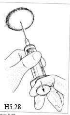 xác định xem có mủ hay không bằng cách dùng kim hút. Khử trùng cho da, gây mê thích hợp. Thực hiện việc hút mủ, sử dụng kim cơ 18 hoặc lớn hơn để xác định nơi trú của mủ (Hình 5.28). Rạch một đường tại điểm thích hợp nhất của ổ áp-xe. Thực hiện một đường rạch để tạo ra một đường dẫn lưu thoải mái và hoàn thiện. Nếu đường rạch quá nhỏ sẽ dẫn đến sự phát sinh lại của áp-xe.