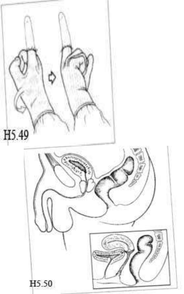 Đưa ngón tay đeo găng đã được bôi trơn vào hậu môn, bề mặt lòng bàn tay quay ra phía sau. Sờ nắn vách sau hậu môn và tất cả những phần nào của hậu môn đối diện với phần cong của xương cùng. Quay ngón tay để kiểm tra bất kì chỗ phình hay đau nào gợi ý cho sự tồn tại của áp-xe chậu (Hình 5.49). Tuyến tiền liệt ở nam giời và cổ tử cung ở nữ giới có thể sờ thấy trước (Hình 5.50). Lùi ngón tay lại và kiểm tra phân, chất nhầy hoặc máu. Lấy mẫu để xét nghiệm. Khi khám trực tràng bệnh nhân bị áp-xe quanh hậu môn sẽ bị đau ở mép hậu môn trong khi bệnh nhân bị áp-xe ụ ngồi trực tràng sẽ bị đau sâu. Nếu nghi ngờ chẩn đoán cần thực hiện chẩn đoán bằng chích hút.