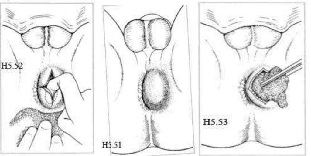 Áp-xe quanh hậu môn có biểu hiện rất đau, viêm, sưng tại chỗ ở vùng ven hậu môn. (Hình 5.51). Áp-xe ụ ngồi trực tràng có biểu hiện bị đau lan rộng cứng lại ở hỗ ụ ngồi trực tràng. Sự biến đổi của những thương tổn này thường ít gặp ở giai đoạn đầu và có thể không bao giờ xuất hiện. Sự đau đớn là dấu hiệu đáng tin cậy của áp-xe quanh hậu môn hay áp-xe trực tràng. Cho dùng kháng sinh và giảm đau. Để dẫn lưu ổ áp-xe, đặt bệnh nhân ở vị trí giống như để cắt sỏi. Rạch một đường giữa trung tâm phần nổi lên nhất của ổ áp-xe. Lấy mẫu để cấy ghép và soi kính hiển vi. Phá huỷ toàn bộ các ô bằng một ngón tay (Hình 5.52). Rửa khoang bằng dung dịch muối và sơ bôi đóng lại bằng gạc tẩm dung dịch muối, để thò ra một ít (Hình 5.53). Đậy vết thương lại bằng gạc khô và băng.