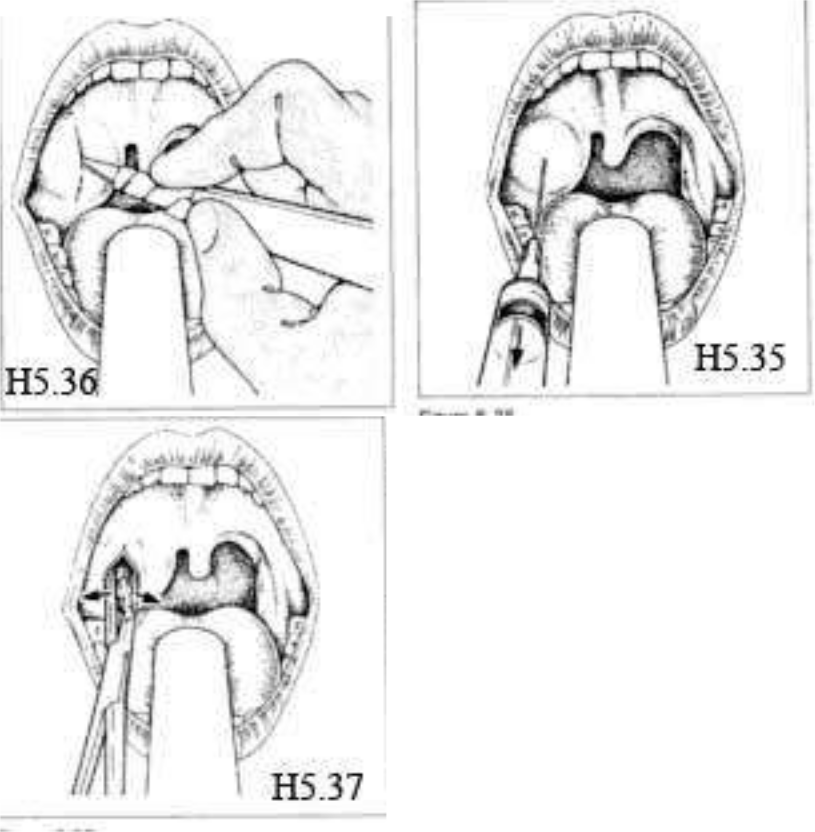 - Kéo lưỡi ra bằng một miếng ấn lưỡi rộng hoặc nhờ một trợ lý giữ nó. Thực hiện chích hút mủ lần đầu, sau đó rạch gần hết phần nhô lên của chỗ sưng(Hình 5.36). Đưa hai đầu kẹp động mạch hoặc kẹp tĩnh mạch vào vết rạch, mở hai gọng kẹp ra để tạo điều kiện cho dẫn lưu (Hình 5.37). Hút khoang bằng ống hút và dội rửa bằng dung dịch muối.