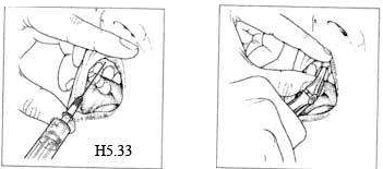 - Đặt bệnh nhân trên ghế có tựa cao để đỡ đầu. Sau khi bệnh nhân súc miệng, đặt gạc tẩm ethanol 70% vào lợi. Cho kim cỡ 25, 25mm tại đường giao nhau của mucoperiosteum của nướu và má, song song với trục răng (Hình 5.33).
