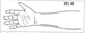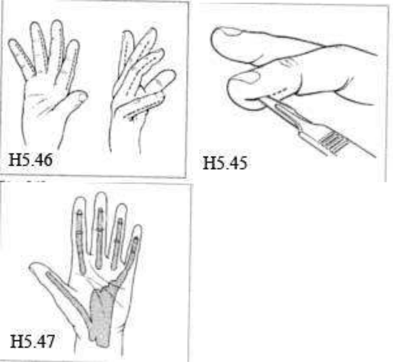 Các nhiễm trùng tại gan bàn tay là kết quả của các nhiễm trùng màng gân lan rộng. Dẫn lưu khu vực nhiễm trùng bằng cách rạch da tại vùng sưng và mềm nhất. Mở sâu hơn bằng kẹp. Thực hiện các vết rạch để dẫn lưu dọc theo nếp gấp da gan bàn tay, dọc theo mép các ngón tay hoặc dọc theo mép cánh tay (Hình 5.48)