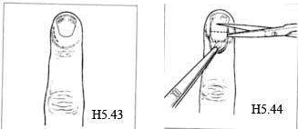 Điều trị viêm mé móng ở ngón tay giữa bằng cách rạch quanh phần bị viêm (Hình 5.43) hoặc cắt lọc một phần móng tay (Hình 5.44)