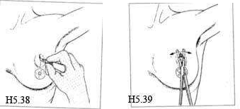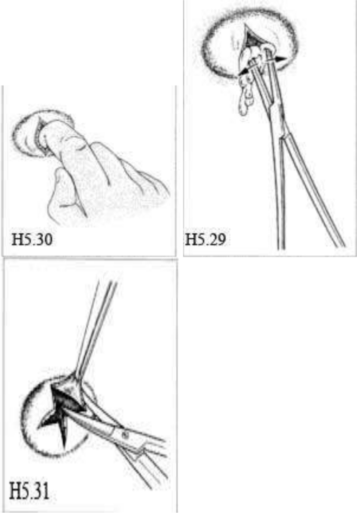 - Dùng hai đầu của kẹp động mạch đưa vào ổ áp xe để mở các miệng của nó (Hình 5.29). Mở ổ áp-xe bằng một ngón tay để phá toàn bộ vách ngăn (Hình