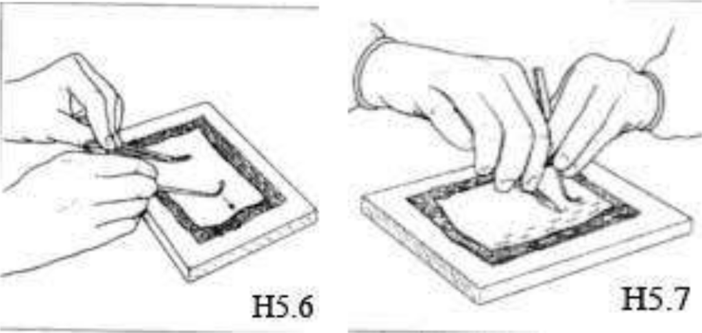 - Cho miếng da mới vào dung dịch muối và đắp nơi cho bằng gạc mỡ. Trải rộng mảnh da lên một miếng gạc có thấm dung dịch muối, để mặt thô lên trên (Hình 5.6)