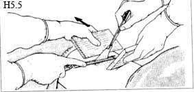 - Lấy những mảnh nhỏ bằng lưỡi dao cạo được kẹp bằng kẹp động mạch hoặc dụng cụ cạo râu khác.Bắt đầu bằng việc đặt mép lưỡi dao lên góc miếng da, sau lần rạch đầu thì để lưỡi dao nằm ngang. Để lấy những mảnh da lớn phải dùng một tay cầm dao ghép da hoặc dao cắt da bằng điện.(Hình 5.4)kéo hết toàn bộ đường biên phần da cho. Hướng dẫn trợ lý thực hiện việc kéo ngược lại để giữ da căng bằng cách giữ đường biên thứ hai theo cách tương tự. Cắt da bằng chuyển động “lùi 1/4” (Hình 5.5)
