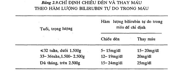 Ở trẻ đủ tháng: 25mg/dl. Chiếu đèn; dùng ánh sáng chiếu qua da gây tác động chuyển bilirubin từ dạng tự do thành dạng kết hợp.