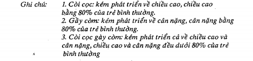 Còi cọc là biểu hiện chiều cao chậm phát triển, suy dinh dưỡng kéo dài, tỉ SỐ còn 90% so với chiều cao chuẩn. Gầy còm – trọng lượng có thể tương ứng với chiều cao dưới 80% trọng lượng chuẩn.